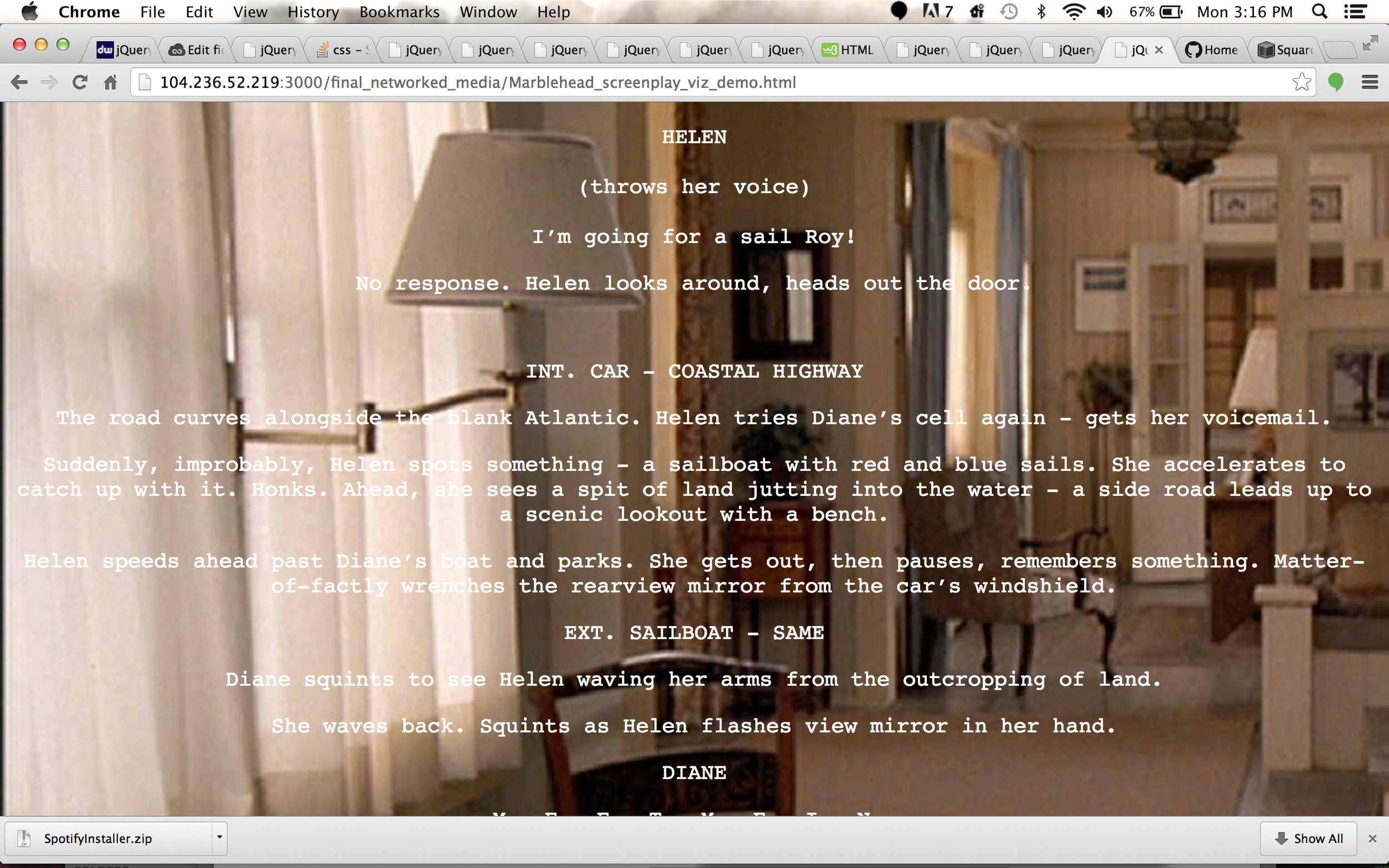 This was my first foray into using JQuery with CSS and HTML.  I avoided using p5.js because it seemed like treading old ground.   I struggled with the selector logic & syntax - do I use (this) or ('*') or the '#div id tag'?  I had difficulty with the CSS style placement but eventually figured it out with help.  Another issue I ran into was using a span class to get screenplay character names for their own hover function.  This caused formatting issues.  I ended up using (body) in my hover() methods.  Another nice CSS discovery was the background-size:cover argument which made sizing my differntly sized images a snap.